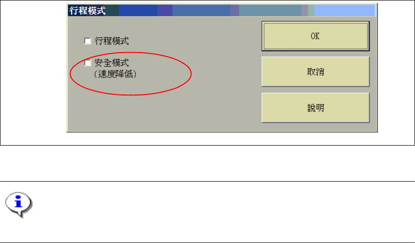 如果核取方塊取消勾選,所㈲的軸都會以最大的可行速度移動。此時 " 降低的速度 " 模式即被取