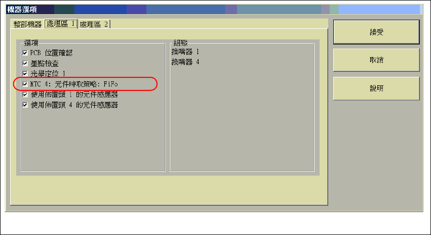 而在 504 版軟體㆖,這個選㊠可以針對各個位置在配備 MTC 2 的 SIPLACE HF ㆖分別啟動。FiFo
