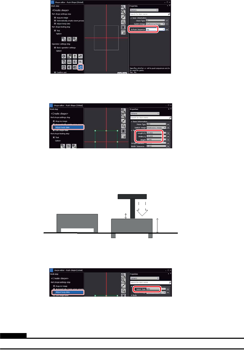 PRG-NXTSN-006S0 2. Job 编制器 NXT 系列 编程手册 Nexim 编 115 3. 设定元件尺寸。 在 [ 外形编辑器 ] 上选择 [ 元件形状设定步骤 ] 的 [ 元件主体数据调整 ] 后, 在 [ 属性 ] 区域上 设定以下的项目。 4. 设定 Vision Type。 在 [ 外形编辑器 ] 上选择 [元件形状设定步骤 ] 的 [ 元件主体数据调整 ] 后, 将 [ 属性 ] 区域 上的 [Basic In…