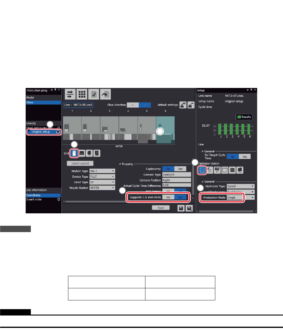 PRG-NXTSN-006S0 2. Job 编制器 NXT 系列 编程手册 Nexim 编 127 Job 的创建 1. 在显示在 [ 生产程序列表 ] 画面的 [ 对象生产线 ] 上选择生产线。 2. 在生产线图上选择作为对象的模 组。 3. 在 [ 单元 ] 上单击 [Module] 图标。 4. 将 [Supports 1.5-inch Parts] 设定为 “Yes”。 5. 在 [Setup] 区域的 [Optimize O…