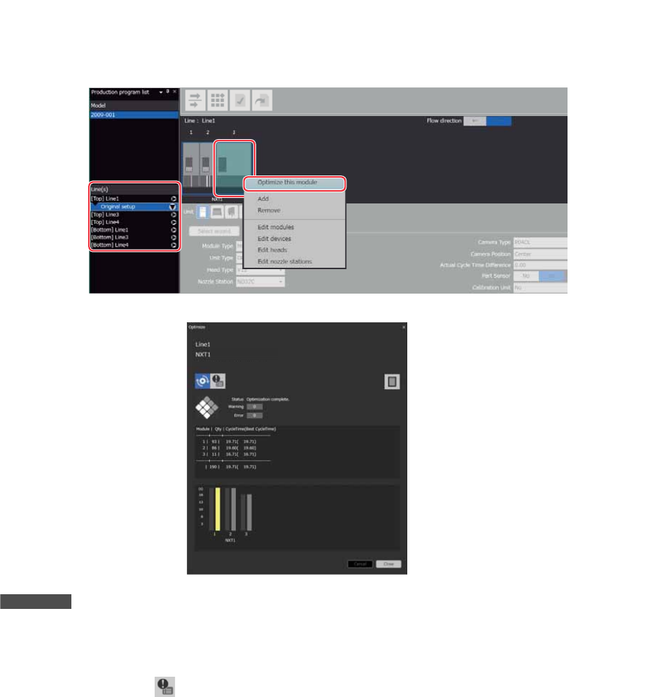 2. Job 编制器 PRG-NXTSN-006S0 166 NXT 系列 编程手册 Nexim 编 2.6 生产线平衡 所谓生产线平衡 (Line B alance)是为了使各个机器的负荷 (工作量)均等,把贴装元件分配到机器的功 能。 请根据以下步骤进行生产线平 衡。 1. 在 [ 生产程序列表 ] 画面上,从 [ 对象生产线 ] 中选择进行生产线平衡的生产线 。 2. 单击 [ 生产线平衡 ] 图标。显示 [ 优化设定 ] 对话框…
