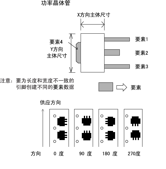 必须在元件数据中输入元件的主体尺寸和 Element Information。另外,对于长度和宽度不同的引脚,定