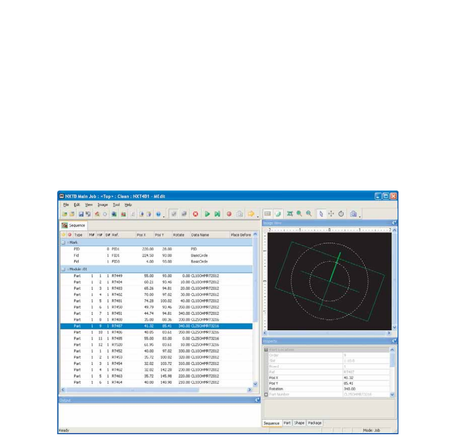通过定位相机获取指定顺序的贴装位置,在 MEdit 中以图表形式比较电路板图型与元件图像 (线框)。该