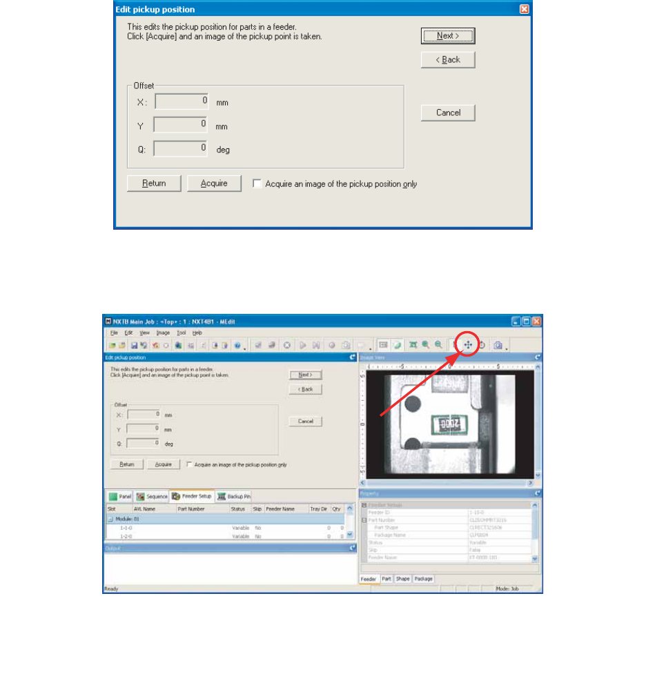 PRG-NXTSN-006S0 5. 其他的 应用 NXT 系列 编程手册 Nexim 编 285 检查供料器中的 X/Y 位置 11. 显示 [Edit pi ckup positio n] 步骤。 请确保已经提前将元件装载到正确位置中, 然后单击 [Acquire] 获 取供料器中的元件图像。获取的 元件图像显示如下。 12. 通过所显示的图像检查 X- 和 Y- 方向上的吸取位置。 如果需要移动吸取位置, 请单击定位按钮 (带有 …