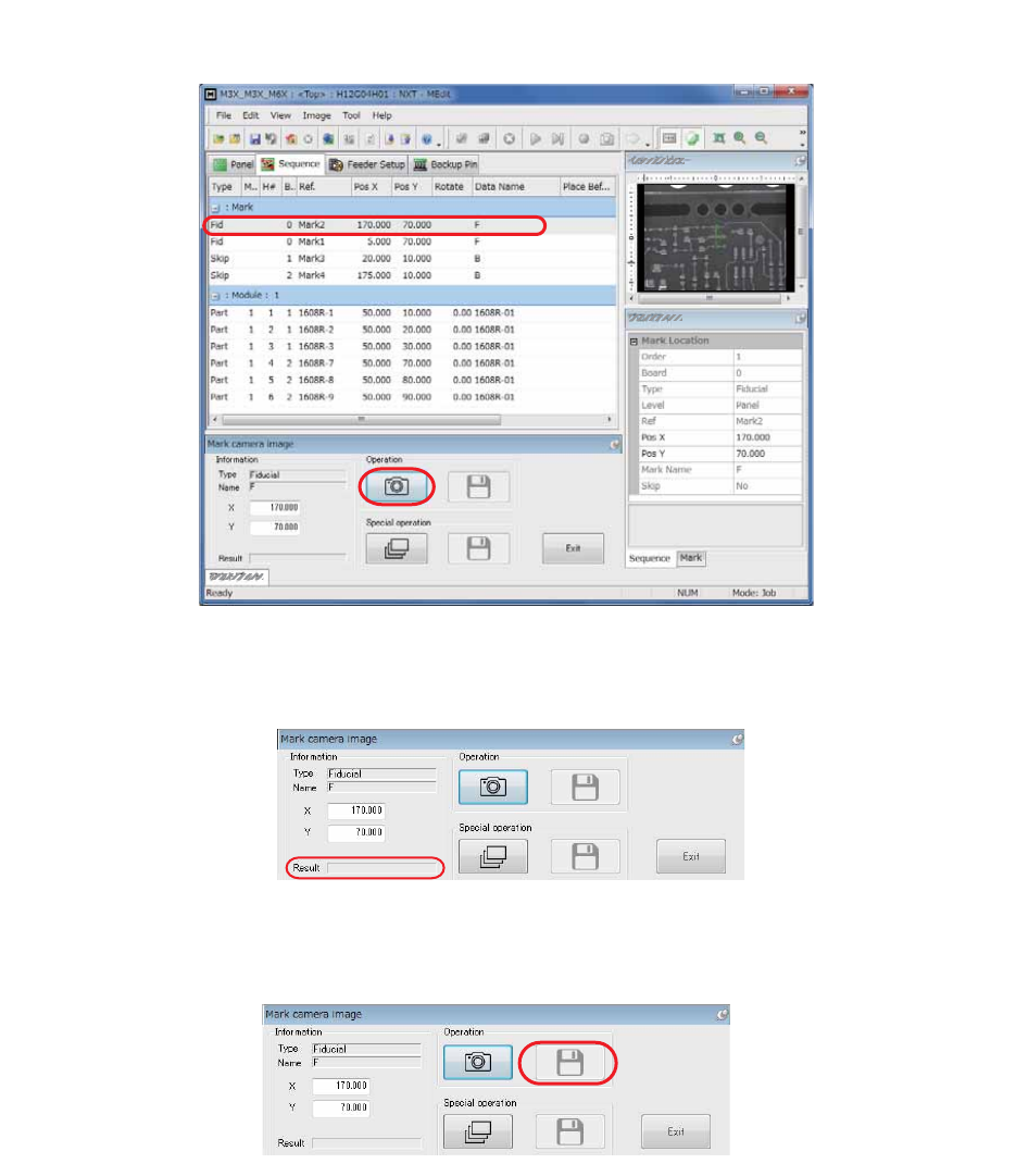 5. 其他的应用 PRG-NXTSN-006S0 300 NXT 系列 编程手册 Nexim 编 5.1.17 使用机器进行定位点数据的影像处理试验 创建不定形基准定位点数据后,可以 在 Job 更新后,使用机器 进行影像处理试验。 1. [Job 的反映 ] 后, 请在选择创建的定位点的顺序坐标后, 按下定位点相机摄像菜单的 [ Operation] 上的 [ 相机 ] 键。使用创建的定位点数据进行影像处理。 a. 定位点相机撮像菜单…