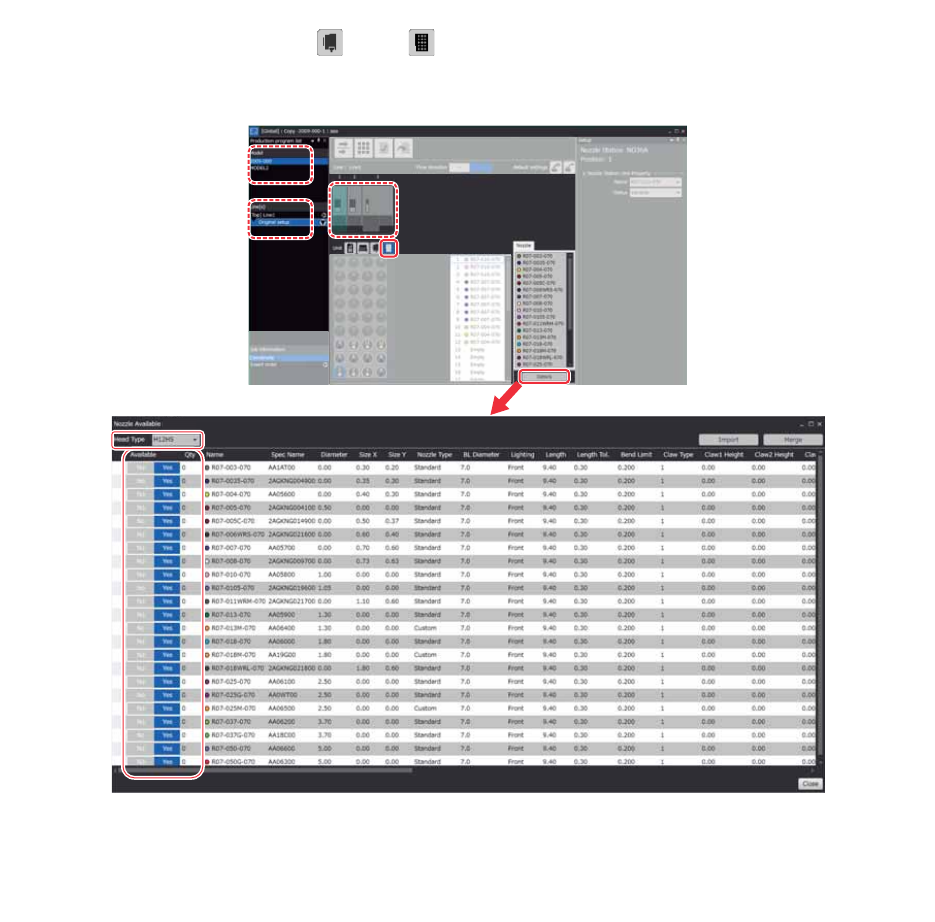 3. 在目的吸嘴的 [Available] 栏内设定吸嘴是否可以使用。可以在此机器上使用的吸嘴设定为 “Yes”,