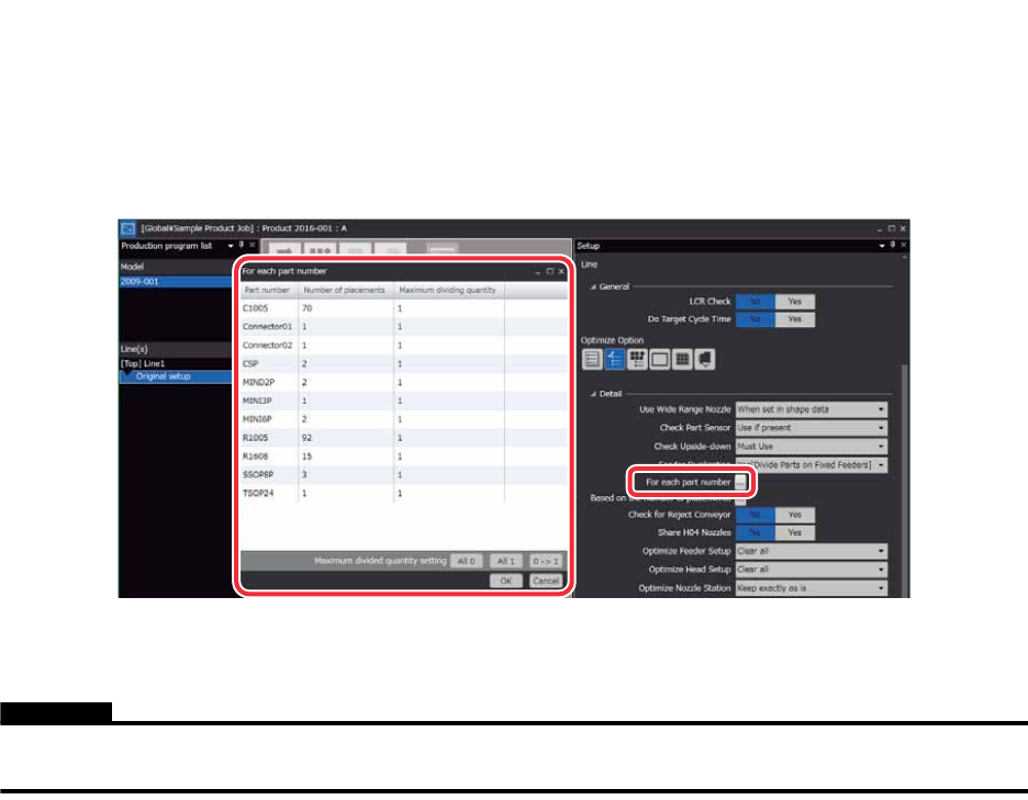 只进行本项设定时,无限制地进行供料器分割。要对每个元件设定分割数的制限时,请参照 「2.5.3 关于供料器分割数量的限制功