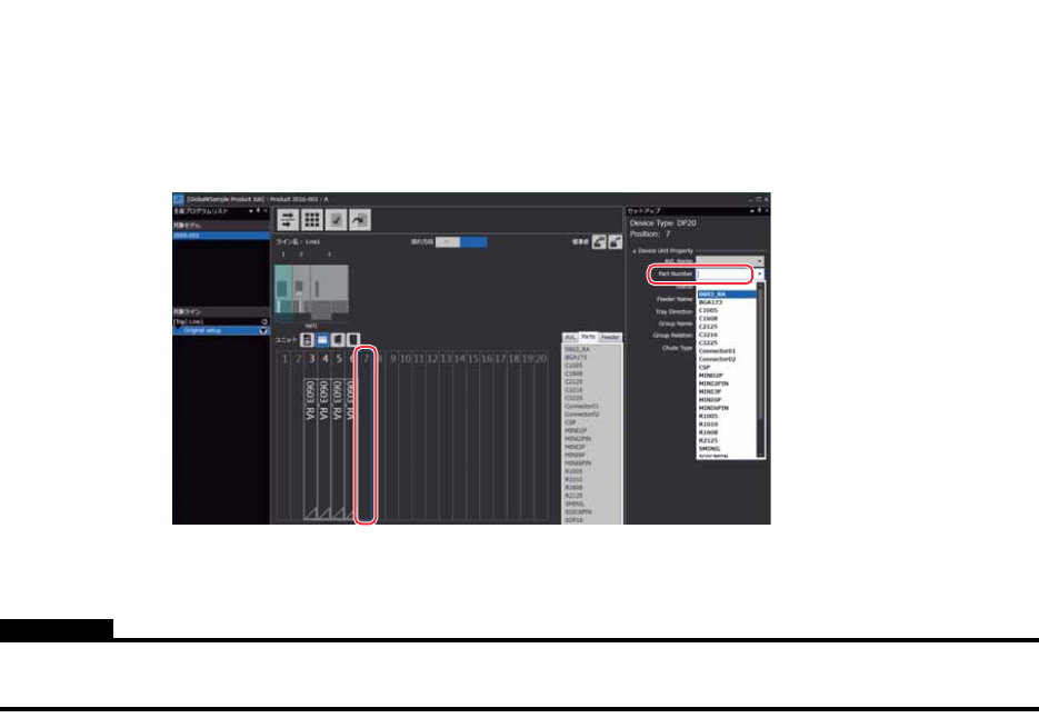 3. 选择追加次供料器的料槽号码后,对[Setup]区域的[Device Unit Property]-[Part Number]输入元件