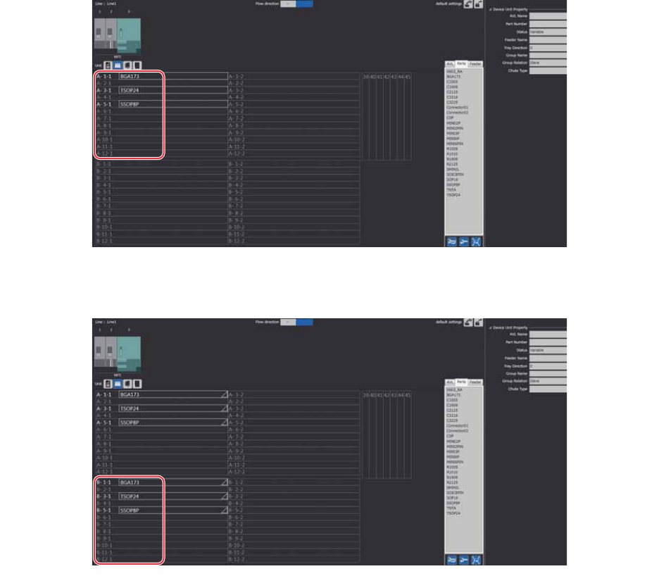 PRG-NXTSN-006S0 2. Job 编制器 NXT 系列 编程手册 Nexim 编 55 6. 料盘箱 B 设定为料盘箱 A 的次料站。与料盘箱 A 同样的 Slot 设定同样的元件号码。 01PRG-0485E 01PRG-0486E