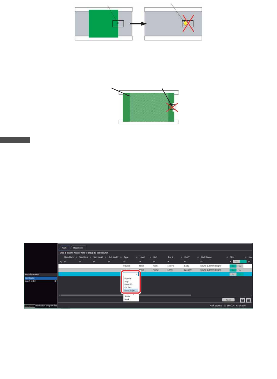 • 搬运轨道中不存在电路板时,所指定的位置中必须不含任何发光物体,例如支撑销。另外,不要在