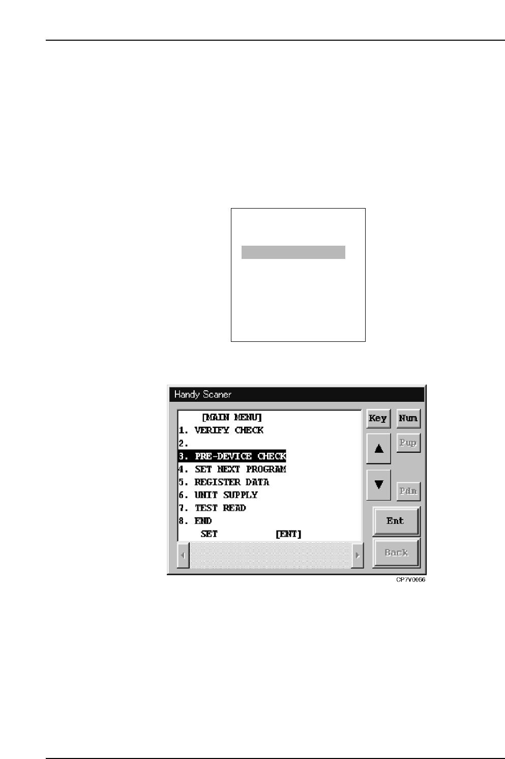 1. At the Handy Terminal's [Main Menu], select [PRE VERIFY CHECK].