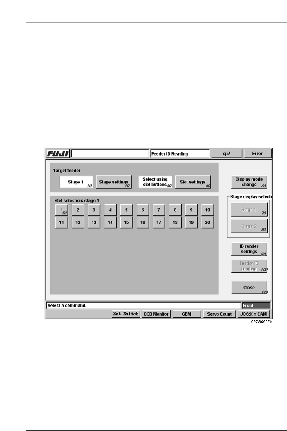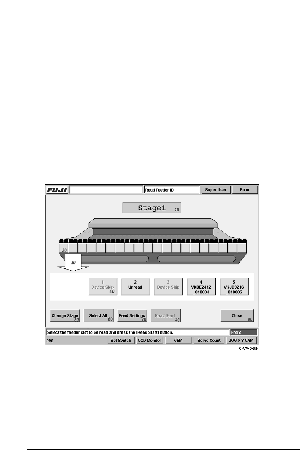 15. Explanation of Operation Screens Edition 2.0 115 CP-7-series V erification System Instruction Manual Screen Explanation 10 Indicates the current Stage number. Display area for all slots. Indicates the feeder ID readi…