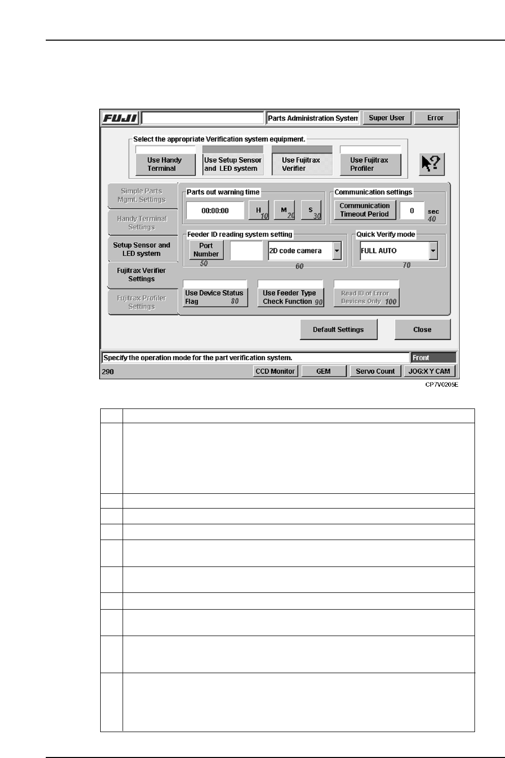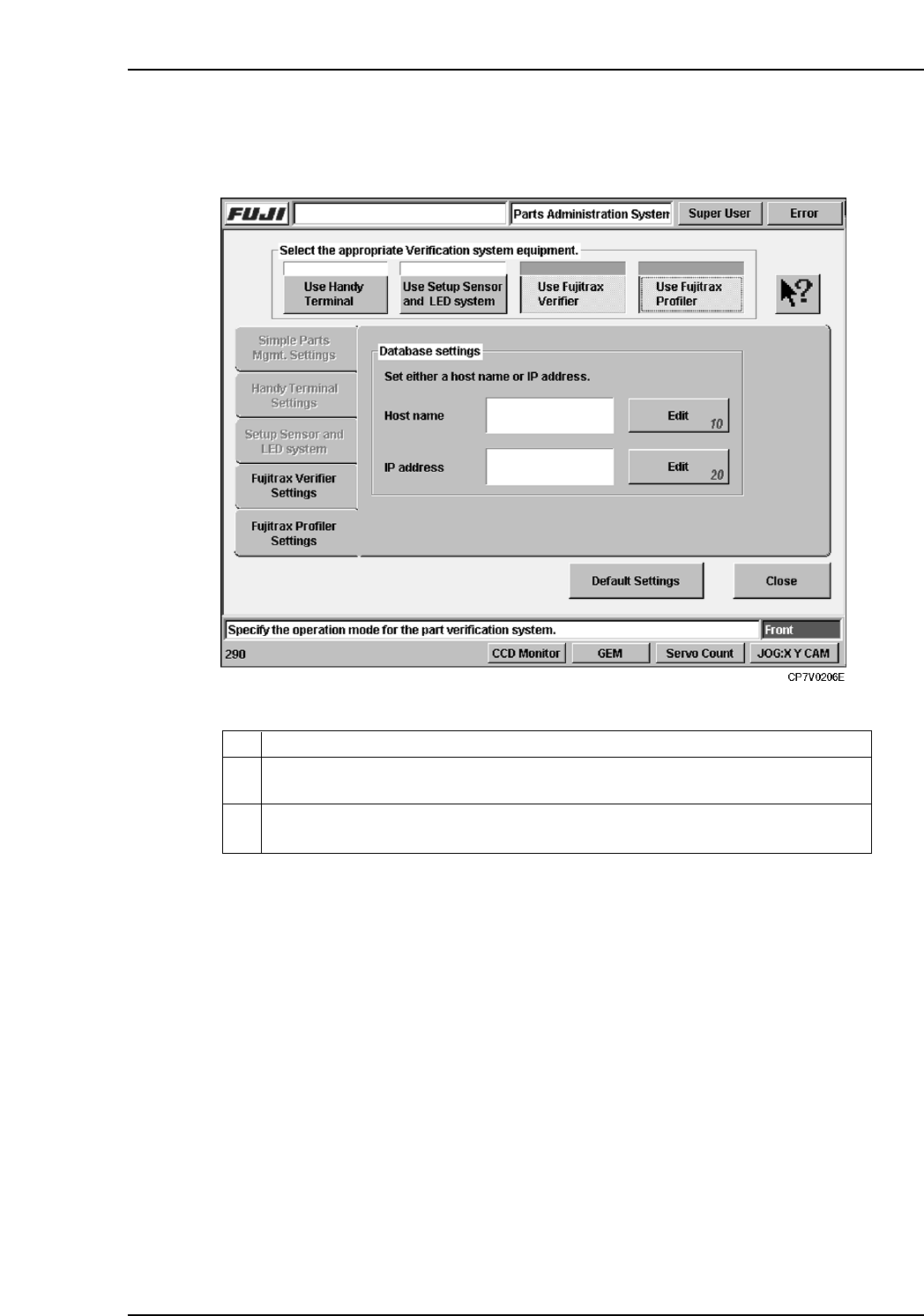 6. Settings Edition 2.0 31 CP-7-series V erification System Instruction Manual 6.6 Fujitrax Profiler Settings T ab The setting items contained in the [Fujitrax Profiler Settings] tab ar e described below . 10 Specifies t…
