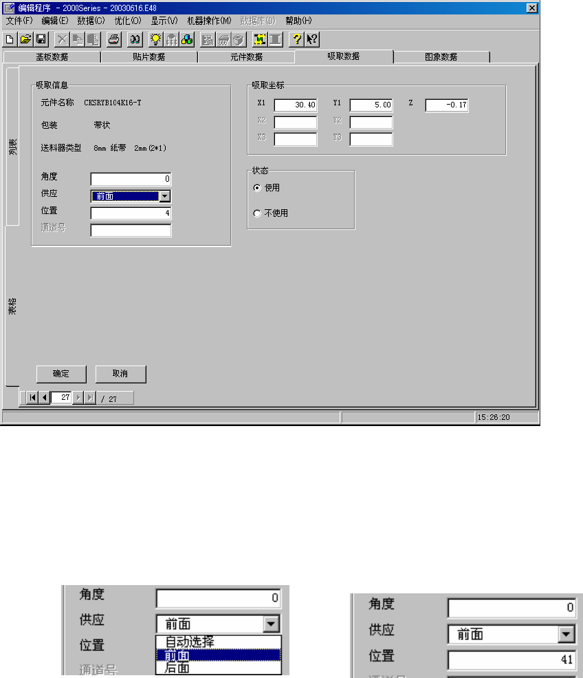 设置“前面”或“后面”后,即可输入“角度”、“位置”、“送料器类型”、“通道”(仅