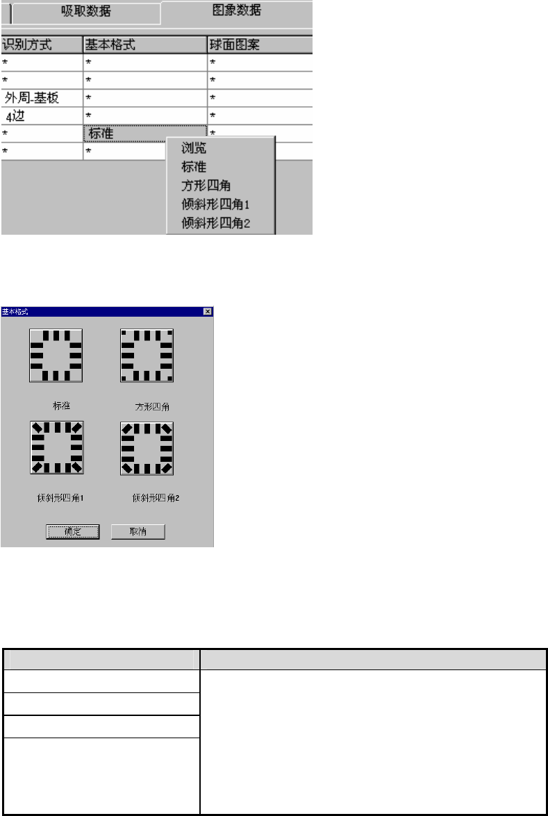 操作手册Ⅱ 2-81 10) 球面图案(仅限于 BGA、FBGA) 设置BGA、FBGA元件识别图案。 仅在“识别方式”为“全球面”或“全垫片”时才能设置球面图案。 请右击或按“F2”键,从显示的列表中选择。 球面图案选择项目一览 球面图案 浏览 从可登录的球面图案列 表中选择。也可查看预 览画 面。 编辑 打开球面图案画面,可设置标准型以外的图案。 标准 BGA 周边 BGA 可选 择满 足附 件 CD“2-3-7-1-2 设置 范围…