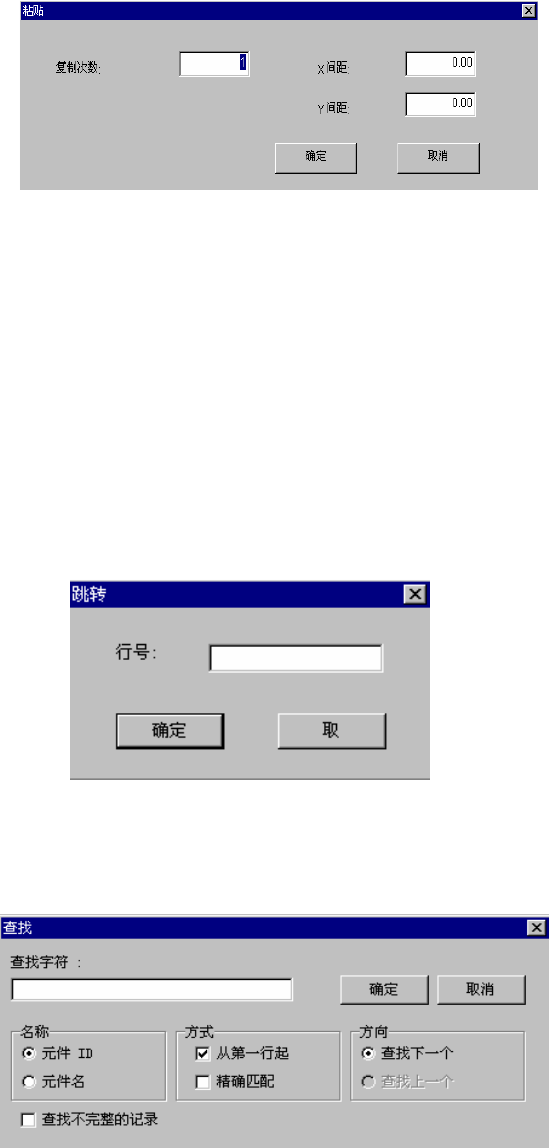 操作手册Ⅱ 2-135 4) 粘贴 粘贴用上述的复制命令选择的范围。 选择粘贴命令后,显示以下画面。 ①复制次数 :指定复制次数。 ②X 间距 :指定 X 方向的贴片位置的增加部分或减少部分。 ③Y 间距 :指定 Y 方向的贴片位置的增加部分或减少部分。 ④确定 :执行粘贴。 ⑤取消 :中止粘贴。 5 ) 插入行 插入空白行。 6) 复制并插入 将光标所在行复制插入到下一行。 7) 跳过 选择跳转命令后,显示如下画面。 8) 查找 可以…