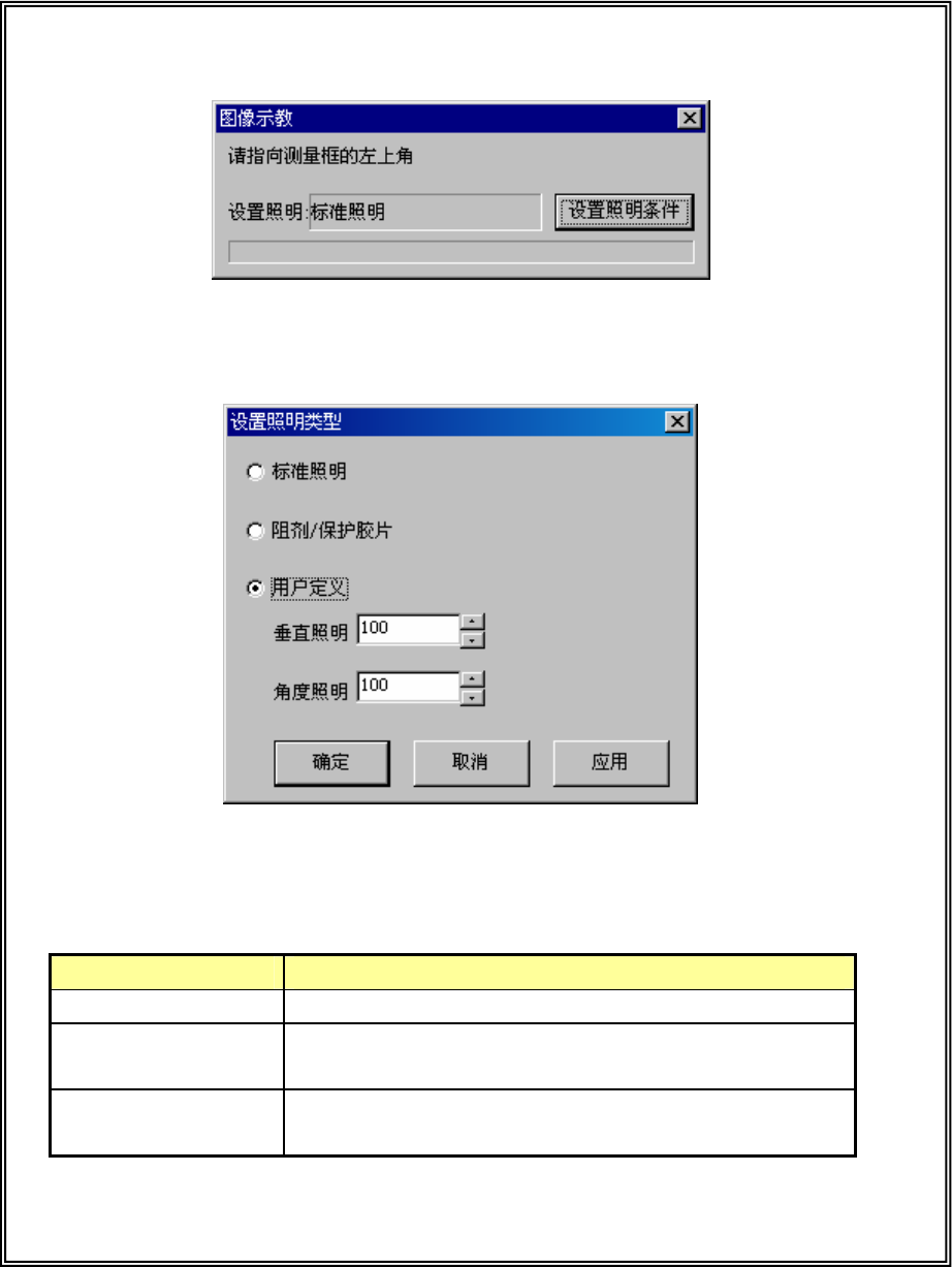 操作手册Ⅱ 2-146 ● 当标记识别不稳定时,请按下设置照明条件按钮,设置照明图案。 请在指定测量框的左上方前,先设置照明图案。 图 2-5-17 设置照明条件 按下设置照明条件按钮,显示如下画面。请设置照明图案。 ·按<应用>按钮确认所设置光量下的图像。 照明图案 处理 标准照明 识别通常的基板标记时使用。 阻剂/保护胶片的图案 照明 在标记上有阻剂或保护胶片,标准照明时标记 反射不佳, 识别不稳定时使用。 用户定义的照…