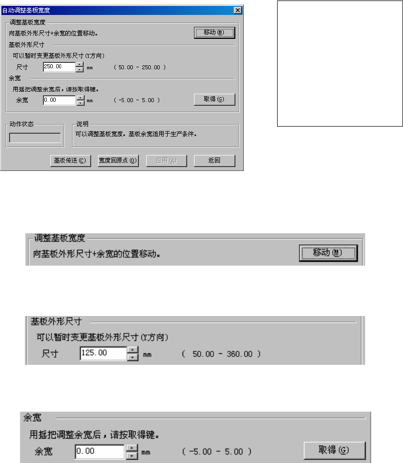 使用机器前面的摇把进行调整后,按下“取得”按钮,将把当前的传送宽度与基板外形尺寸的差