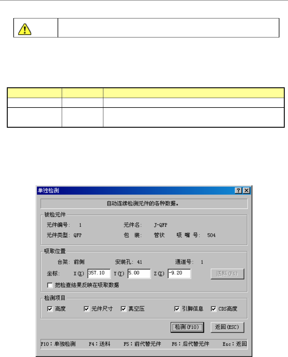 操作手册Ⅱ 2-157 2-5-4-2 测量 本功能为:在贴片头上 安装实际使用的元件,执行 测量(检测)后,把其数据 反映到生产程序。 为了避免人身伤害,在机器运行过程中,切勿将手和头伸入装置内部。 2-5-4-2-1 检测模式 有“连续检测”和“单独检测”2种检测模式。可通过菜单选择切换运行模式。 以下为各模式的功能。 表 2-5-4-2-1 检测模式的内容与菜单 检测子菜单 运行模式 运行内容 单独 单独检测 检测元件画面表格中显…