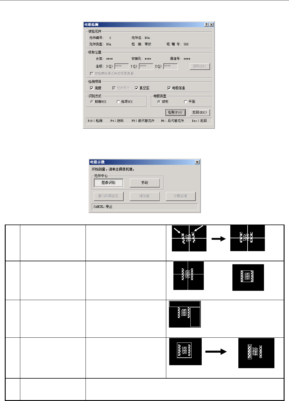 操作手册Ⅱ 2-171 2-5-4-6 元件示教 本功能用于对球形元件(通用画像元件、BGA、FBGA)的球面进行测量。 详细情况请参见使用说明书 CD。选择元件示教后,显示图像元件示教画面。 单击[测量(F10 )]按钮后,开始测量。 吸取元件后,显示球图像示教中的画面。请执行示教。 ① 示教元件倾斜 指定元件的左上角和右上 角,校正倾斜角度。 ② 示教元件中心 (只限通用图像元件) 用图像识别或手动指定元 件中心。 也 可 用 HO…