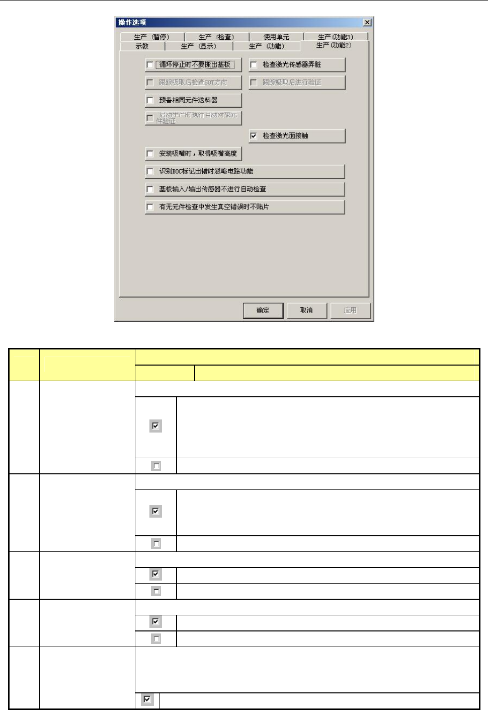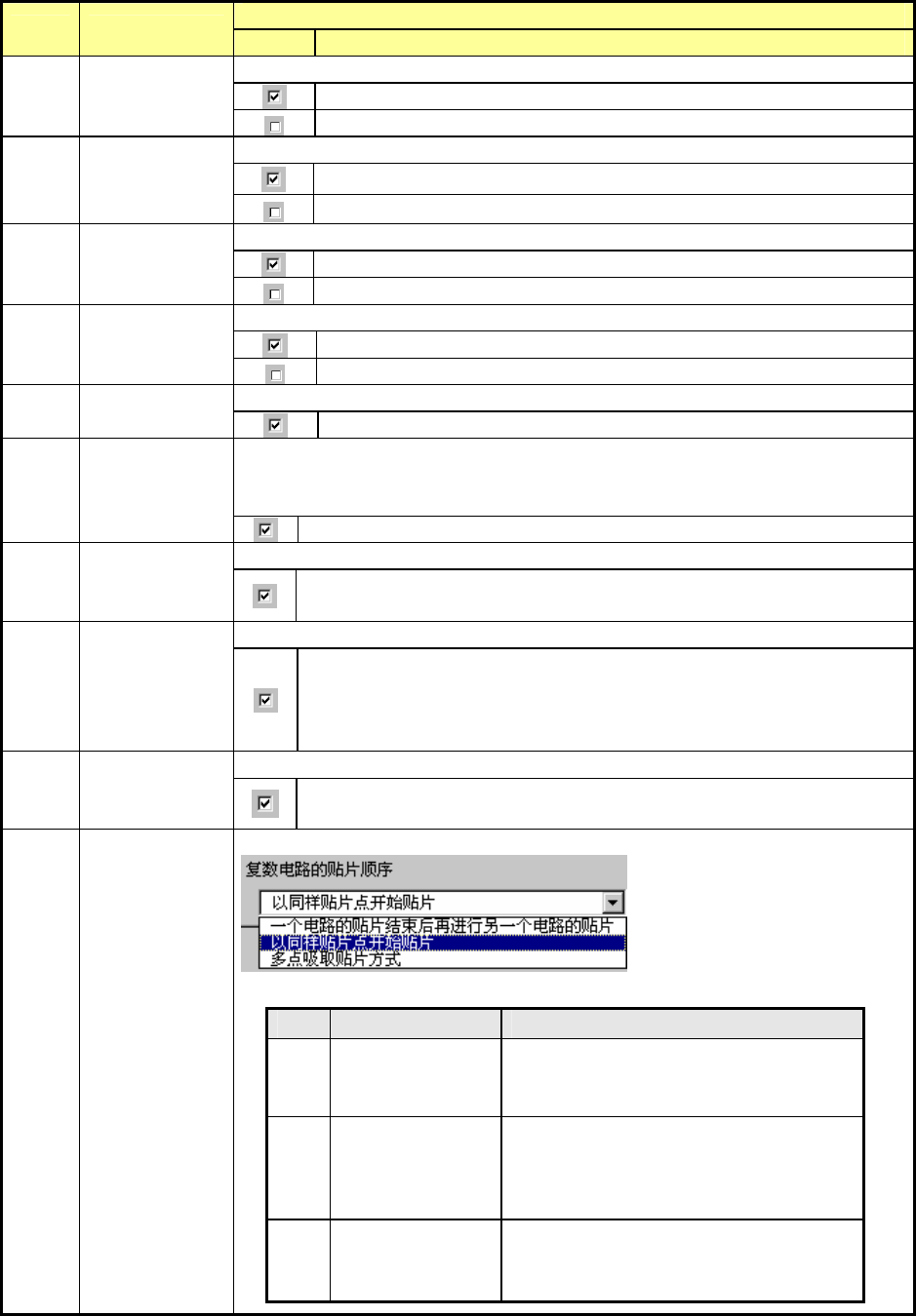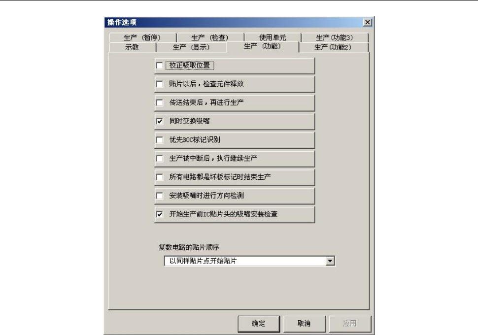 操作手册Ⅱ 4-38 内容 序号. 项目 状态 动作及详细内容 设置是否执行吸取位置校正。 根据定心结果对吸取位置进行校正。 1 校正吸取位置 忽视元件数据指定的“吸取位置校正 ” ,不执行校正。 设置元件贴片时是否要检查元件脱离 了吸嘴。 元件贴片后 Z 轴上升时,用激光确认元件未残留在吸嘴上。 2 贴片以后, 检查 元件释放 忽视元件数据中指定的“检查元件释 放” ,不进行检查。 设置生产动作是否要等待传送。 夹紧基板未完成前,不开…