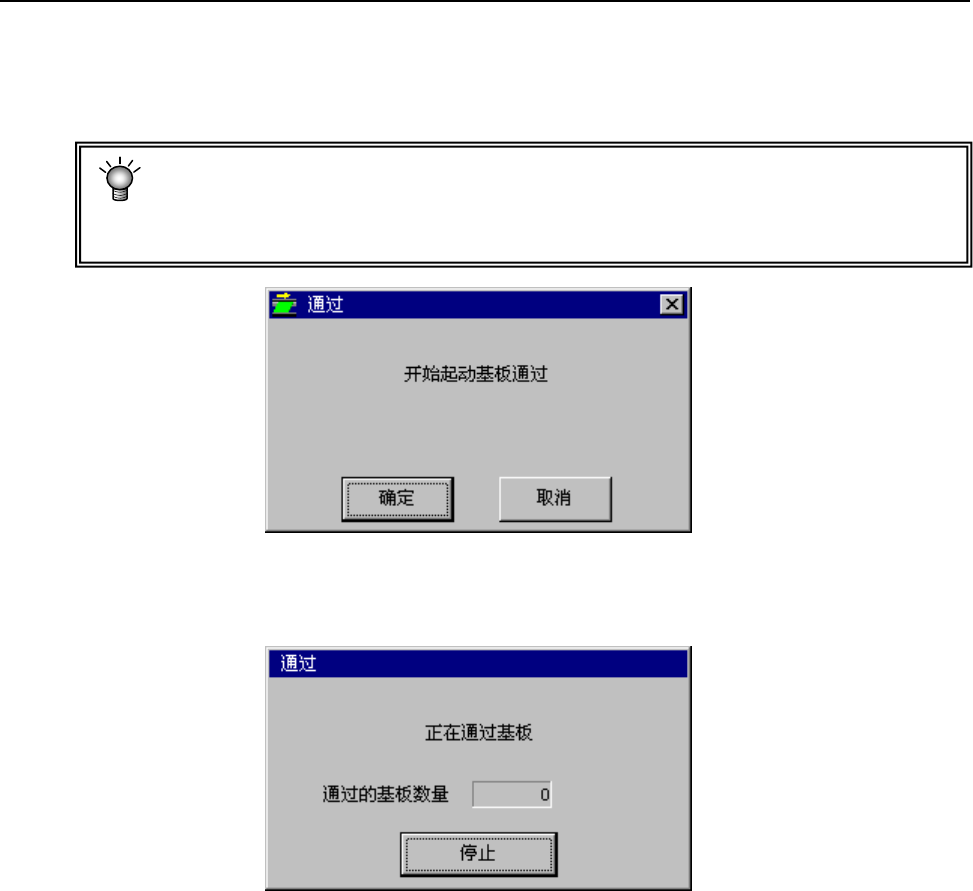 操作手册Ⅱ 1-30 1-6 通过模式 在不进行生产、为传送缓冲基板通过时使用该模式。 从主画面的菜单栏中选择“维护”/“通过模式”后,显示以下画面。 此时,虽然无需返回原点,但需根据基板的尺寸来调整传送宽度。 即使由于设备的故障而无法返回原点,有时也能执行通过模式。 此时, 为了防止因传感器的误检测而导致停止, 请把贴片头组件移到离传送路线远一 些的位置上。(=大约在校准块的上方) 单击“确定”后,显示如下画面,传送传感器检测到有基板…