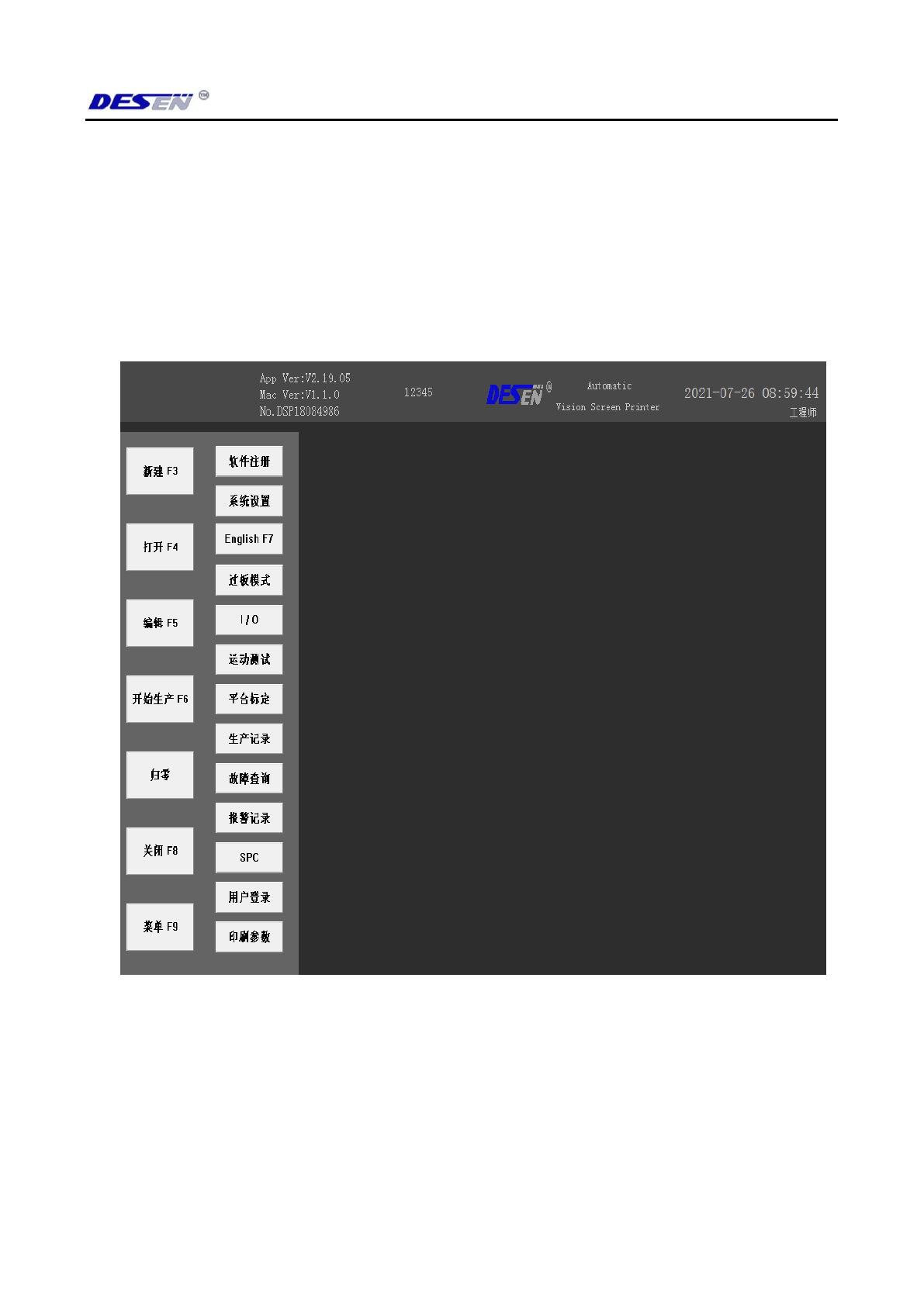 深圳德森精密设备有限公司 第 五章 电气解析 22 第四章 操作系统说明 4.1 系统启动 打开机器主电源 开关 , 将自动进入程序 主界面,操作 如下: 4.1.1 设备启动 (图 1 -1 — > 图 1-2 ) ( 图 1-1) 包括:主菜单栏 、机器对应型号、 软件版本信息、用 户信息。