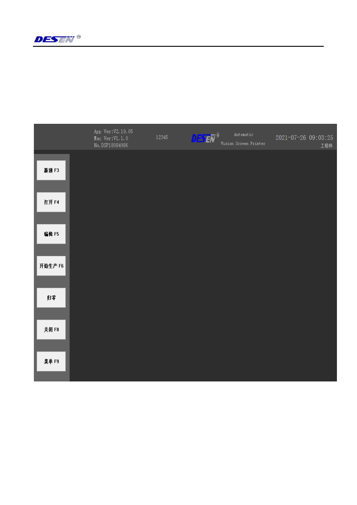 开工程(F4),编辑工程(F5),开始生产(F6),中英文切换(F7),关闭软件(F8),主菜单扩
