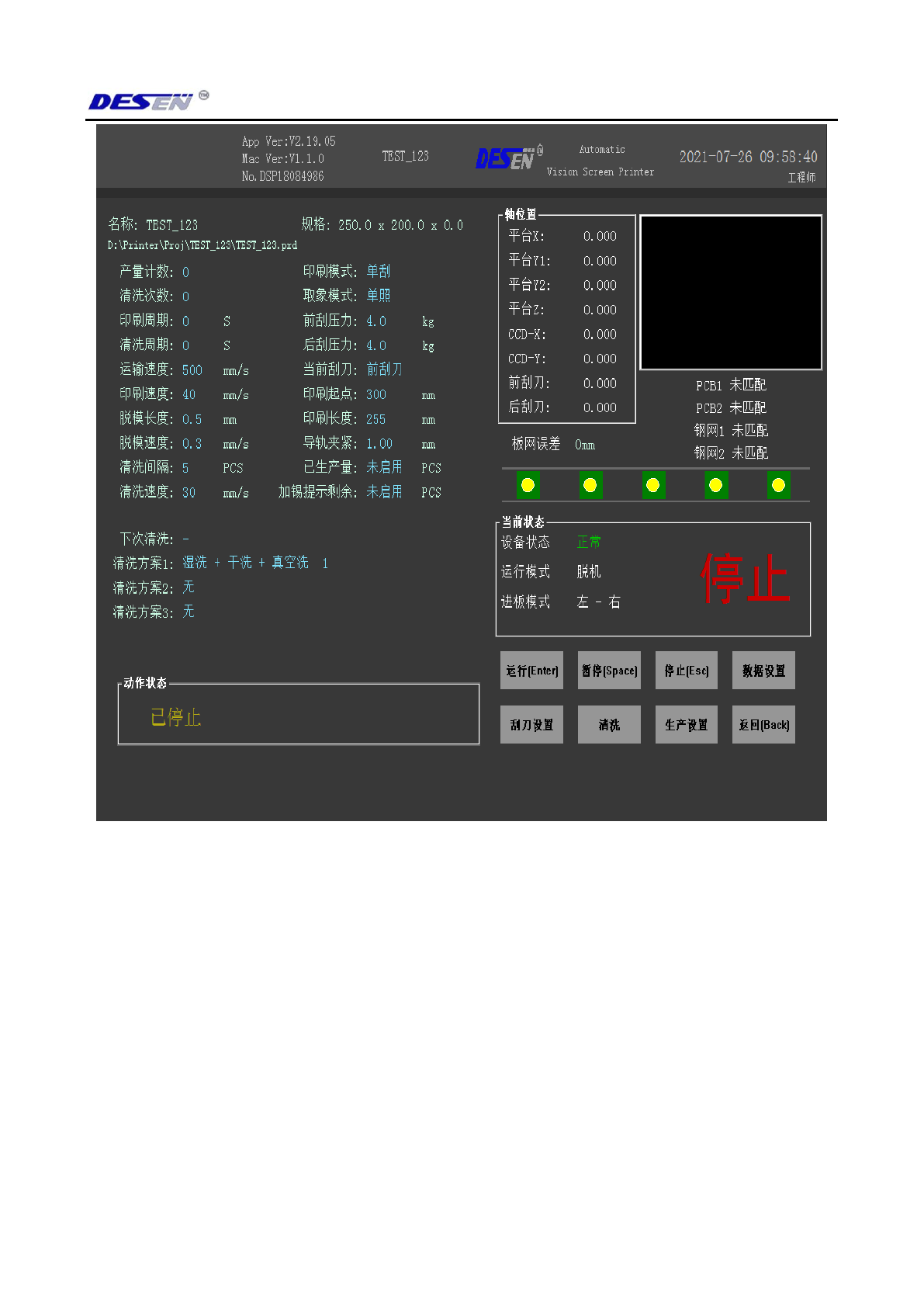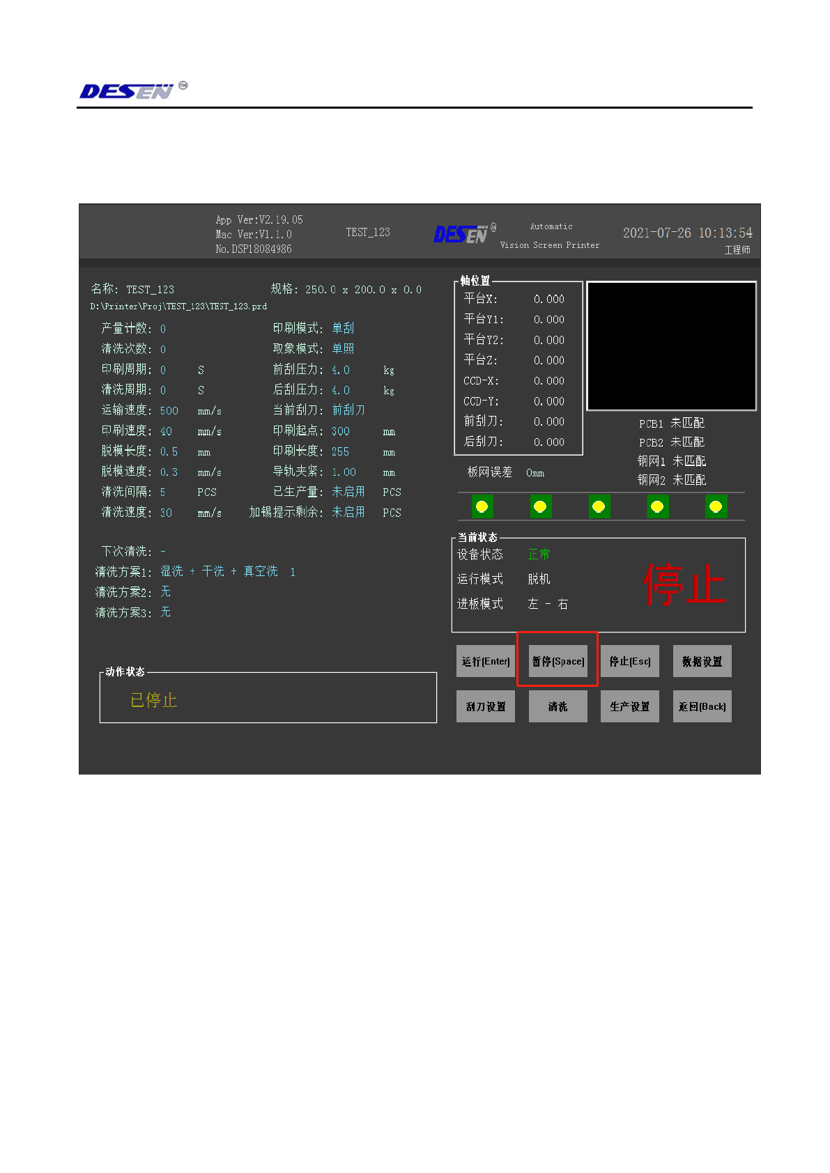 深圳德森精密设备有限公司 第 五章 电气解析 34 ( 图 5-2) 4.2.5-1 、按键盘快 捷键回车 (Enter) 就是开始生 产模式。 4.2.5-2 、按键盘快 捷键空格 (Space) 就是机器暂 停模式。 4.2.5-3 、按键盘快 捷键退出 (Esc) 就是 机器停止模式。