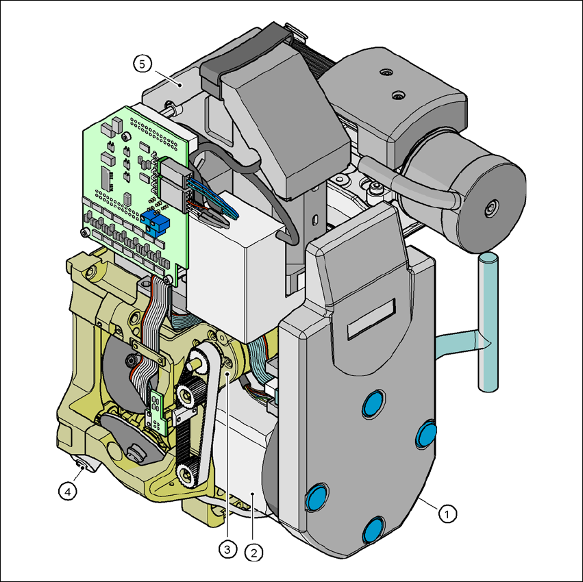 SIPLACE HF 系列用户手册 3 技术数据 软件版本 SR.505.xx 2004 年 7 月中文版 3.7 贴片头 103 3.7.3 用于高速 IC 贴片的 6 段位器收集贴片头 (1) 图 3.7 - 6 6 段位器收集贴片头 - 功能组一 (1) (1) 真空发生器 (2) D P 马达, DP 轴 (3) 带有 6 个段位器光栅盘的星形 轴 (4) 吹气压力阀 (5) 消声器