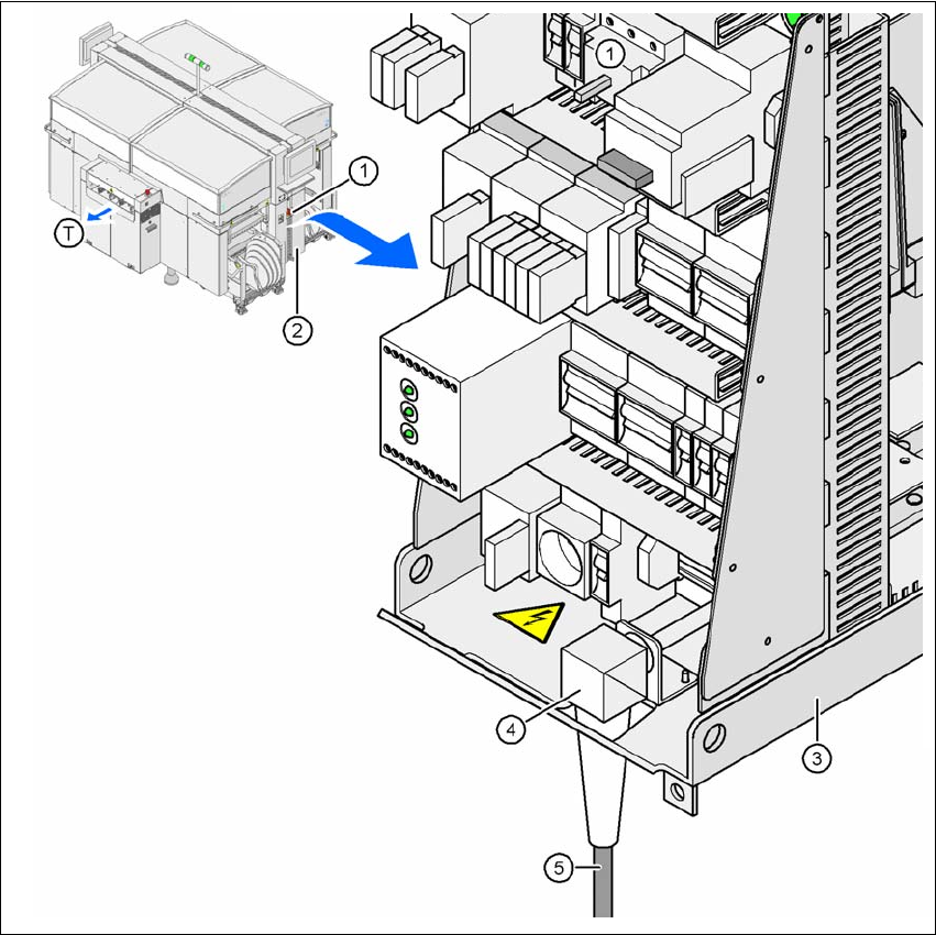 3 技术数据 SIPLACE HF 系列用户 手册 3.8 电气与气动连接点 软件版本 SR.505.xx 2004 年 7 月中文版 112 3.8 电气与气动连接点 3.8.1 电气连接点 (1) 图 3.8 - 1 贴片机上的电气连接点 (1) (1) 主电源开关 (2) 电源单元上的盖子 (3) 电源单元 (4) 电缆密封套的角度 (5) 电源电缆 (T) PCB 传送方向