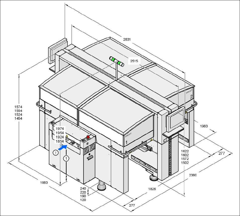 3 技术数据 SIPLACE HF 系列用户 手册 3.9 贴片机的尺寸和重量 软件版本 SR.505.xx 2004 年 7 月中文版 114 3.9 贴片机的尺寸和重量 3.9.1 HF 贴片机尺寸 (1) (1) (1) (1) (1) 图 3.9 - 1 HF 贴片机尺寸 (贴 片机主体) ,用 毫米表示