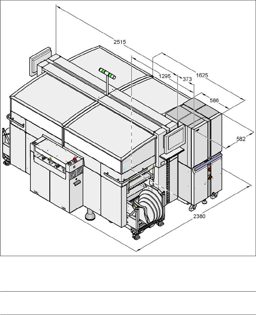 3 技术数据 SIPLACE HF 系列用户 手册 3.9 贴片机的尺寸和重量 软件版本 SR.505.xx 2004 年 7 月中文版 120 3.9.8 带有矩阵式料盘交换器的 HF 贴片系统尺寸 (1) (1) (1) (1) 图 3.9 - 6 带有矩阵式料盘交换器的 HF 贴片系统尺寸,用毫米表示 (1) 请注意 3 矩阵式料盘交换器可装载到料车的 位置 2 和位置 4 。