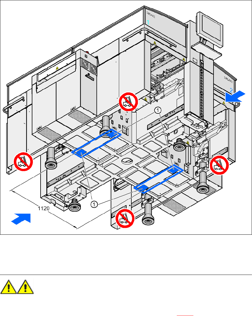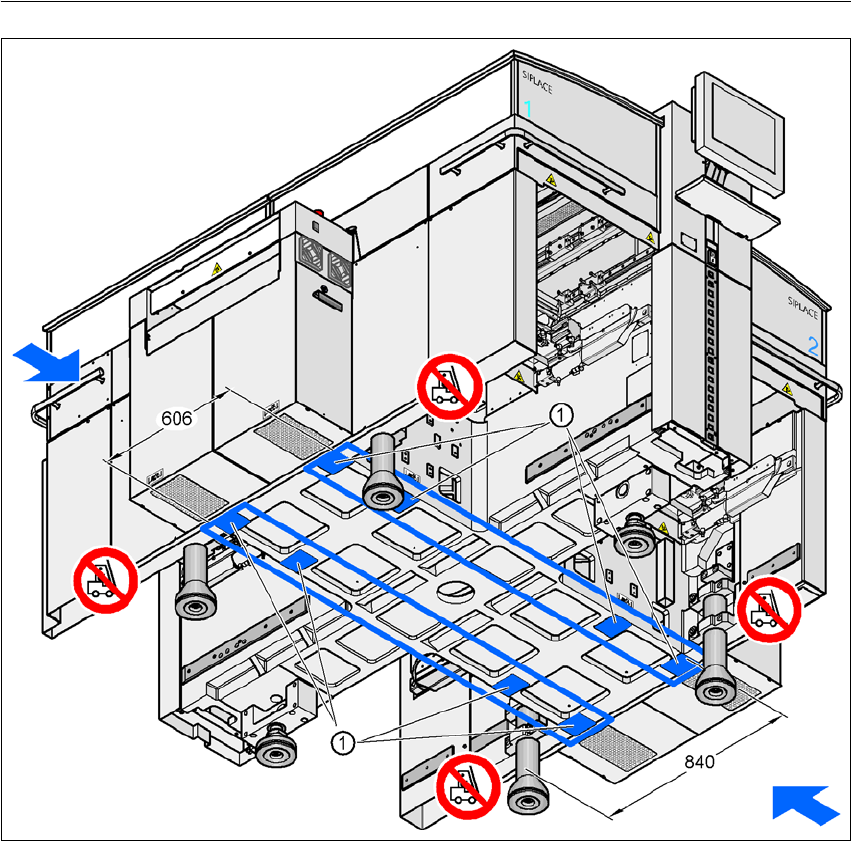 4 安装和试运行 SIPLACE HF 系列用户手册 4.3 交付时的配置和运输 软件版本 SR.505.xx 2004 年 7 月中文版 160 垂直于 PCB 传送导轨的叉子 4 4 图 4.3 - 3 接触表面 - 垂直于 PCB 传送方向的叉子 (1) 叉车叉子的接触表面 警告 抬升贴片机 之前 ,必须注意以下几点,以免贴片机 受损,无法修复: - 叉子的间距必须在 800 到 900 mm 之间 。 叉车的插入表面, 见图 4…