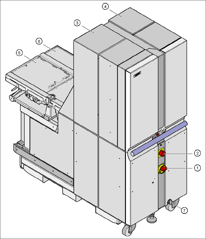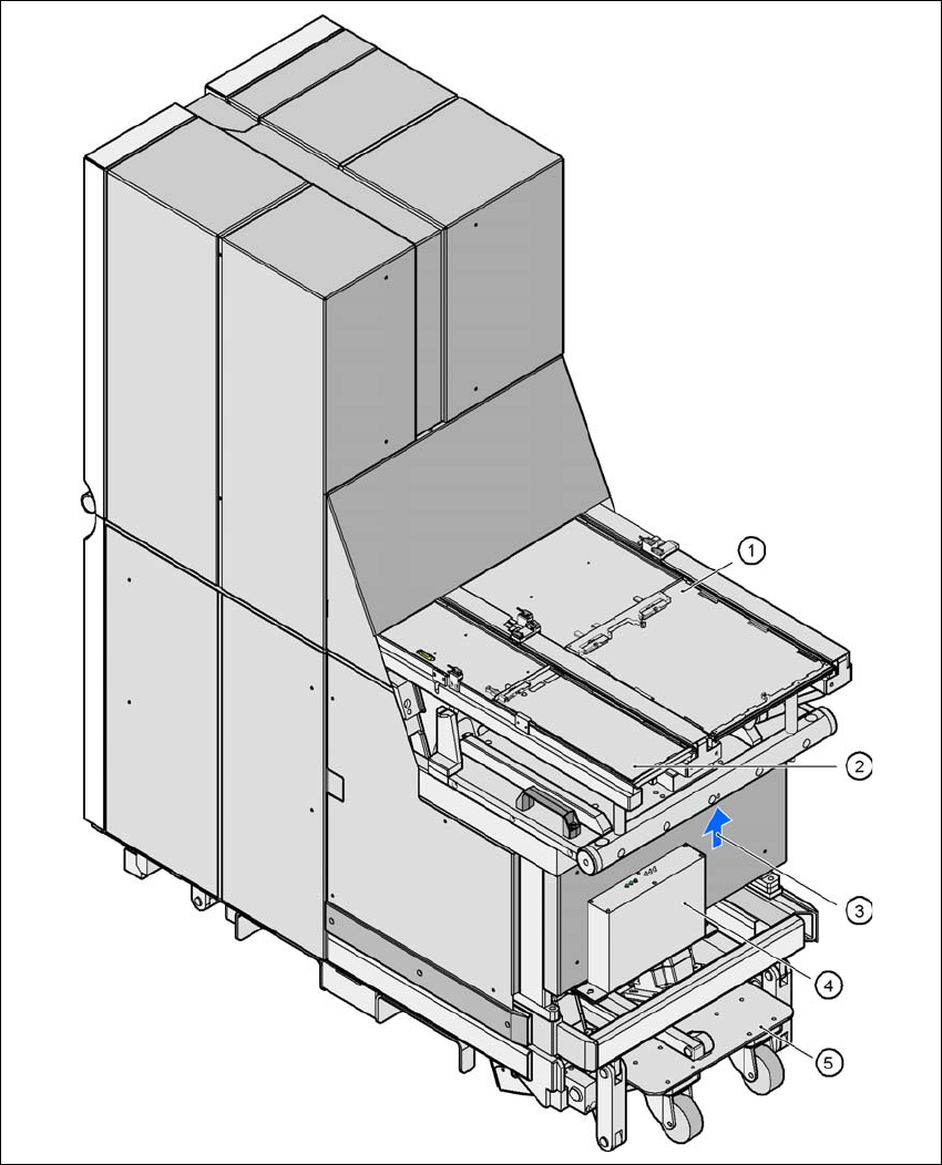 SIPLACE HF 系列用户手册 6 元件的处理 软件版本 SR.505.xx 2004 年 7 月中文版 6.5 矩阵式料盘交换器 275 6 图 6.5 - 2 矩阵式料盘交换器 2 ,前视图 (1) 平送轴 1 (2) 平送轴 2 (3) 载入贴片机接口插头 (4) 电子控制部件 (5) 集成底盘