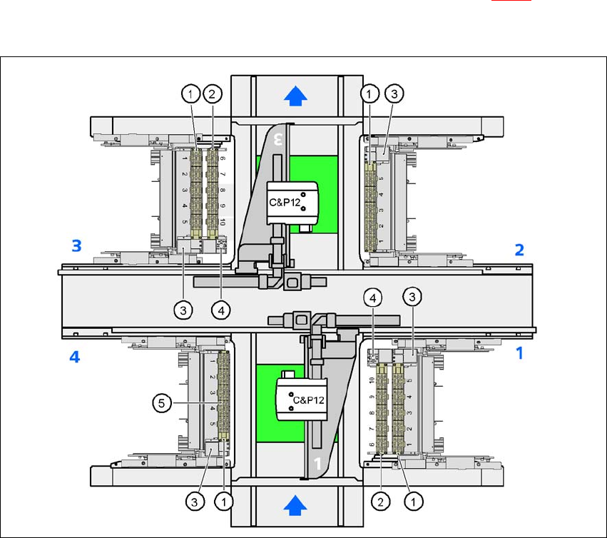2)。一个吸嘴交换器可安装在 2 和 4 位置。 6 个吸嘴交换器可以容纳 30 个吸嘴盘和 360 个吸嘴