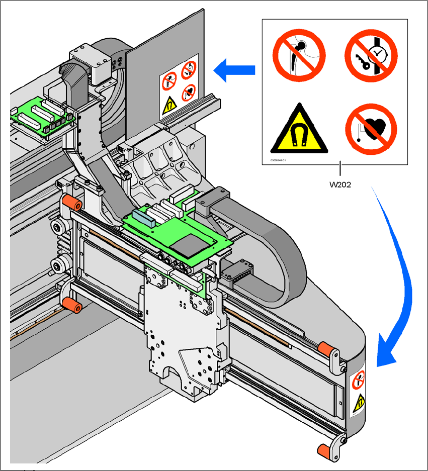 2 安全操作 SIPLACE HF 系列用户 手册 2.2 警告标签 软件版本 SR.505.xx 2004 年 7 月中文版 34 2.2.2 悬臂上的警告标签 W202 图 2.2 - 3 悬臂上的警告标签 W202 位置 W202 ,部件号 0300934 1-01
