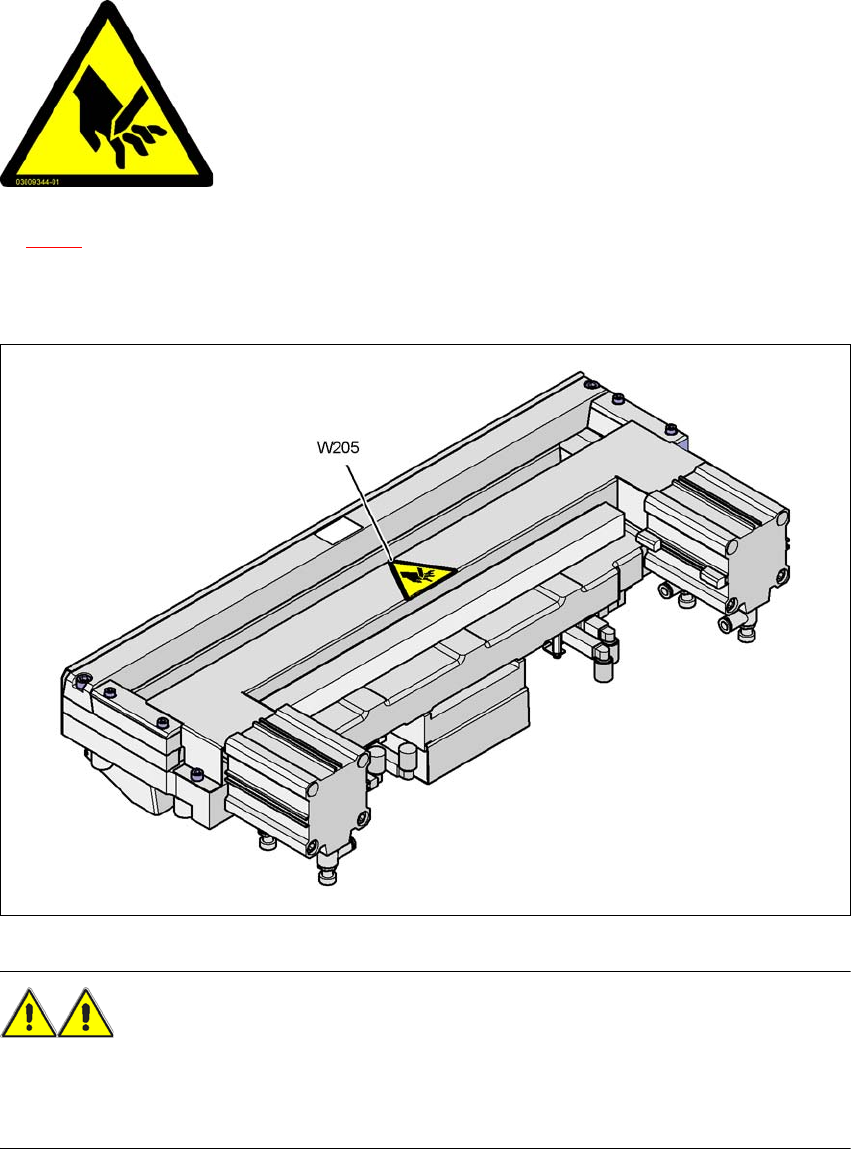 SIPLACE HF 系列用户手册 2 安全操作 软件版本 SR.505.xx 2004 年 7 月中文版 2.2 警告标签 37 2.2.3.2 料带切割器底部的警告标签 W205 2 图 2.2 - 5 料带切割器底部的警告标签 W205 2.2.3.3 废料带斜槽上的警告标签 W205 2 图 2.2 - 6 废料带斜槽上的警告标签 W205