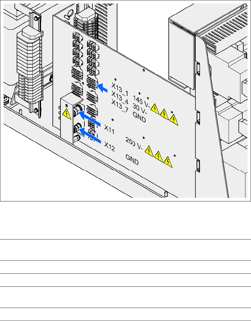 2 安全操作 SIPLACE HF 系列用户 手册 2.7 贴片机中的剩余电压和放电时间 软件版本 SR.505.xx 2004 年 7 月中文版 70 图 2.7 - 2 电源单元上的测量点 2.7.1 按下 EMERGENCY -STOP (急停)按钮后的工作电压、剩余电压和放电时间 X12 (地线)处测得的 插座 X1 1 , X13_1 正常状态下的电压 急停后的剩余电压 放电时间 X11 直流 +250 V < 直流 1…