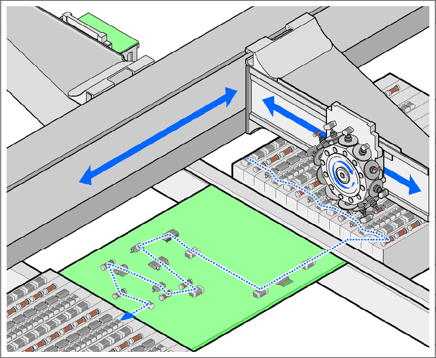 贴片头从料车上的固定供料器或矩阵式料盘交换器的料盘中取出元件,并贴装同样静止的 PCB