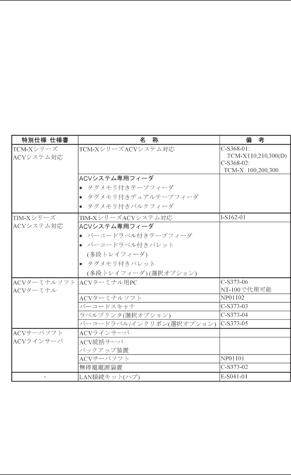 AHR01JGP 4. システム構成 4. 4. 4. 4. 4. システム構成 システム構成 システム構成 システム構成 システム構成 Fig.1 ACV システム対応 (TCM-X シリーズ) Table 2 • TCM-X シリーズ • ACV システム専用フィーダ ACV システム対応 その他 Table 3 • TIM-X シリーズ • 無停電電源装置 (UPS) ACV システム対応 • ACV ラインサーバ • バーコード…