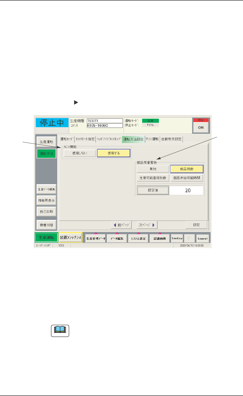 AHR01JGP Fig.4 *2 *2 *2 *2 *2 部品残量警告 部品残量警告 部品残量警告 部品残量警告 部品残量警告 各フィーダごとに読み込まれる部品残数データをもとに、 部品残 量の警告を行うことができます。 警告は、 生産運転画面の [オペ レータメッセージ] 部分に “部品残量警告あり” が表示され、 “ACV チェック状況” 画面で警告対象フィーダを確認することができま す。 [ [ [ [ [ 部品残数 部品残数 …