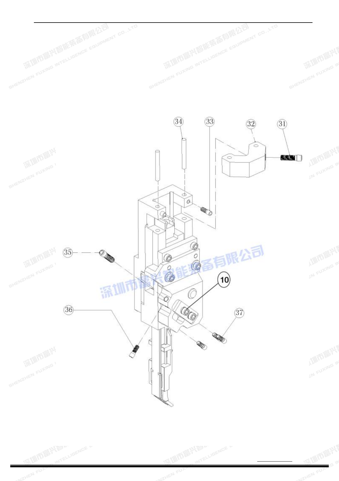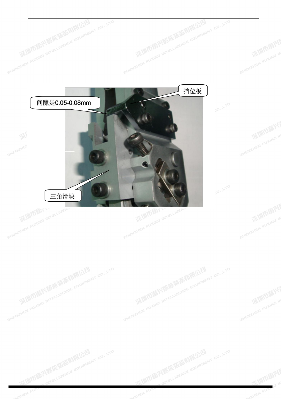 深圳市富兴智能装备有限公司 http:// www .fuxingai.com http:// www.fxznsmt.com - 106 - 3 ) 调 整 ○ 28 FXR-CJ13019 三 角 滑块 的 松 紧 度 , 使 其 上 下 顺 畅, 前 后 不 晃动 。 3) 三 角 滑 块 ○ 28 FXR-CJ13019 与 挡 位 板 ○ 6 FXR-JL13015 的 间 隙 在 0.05mm-0.08mm 之 间 。 4)…
