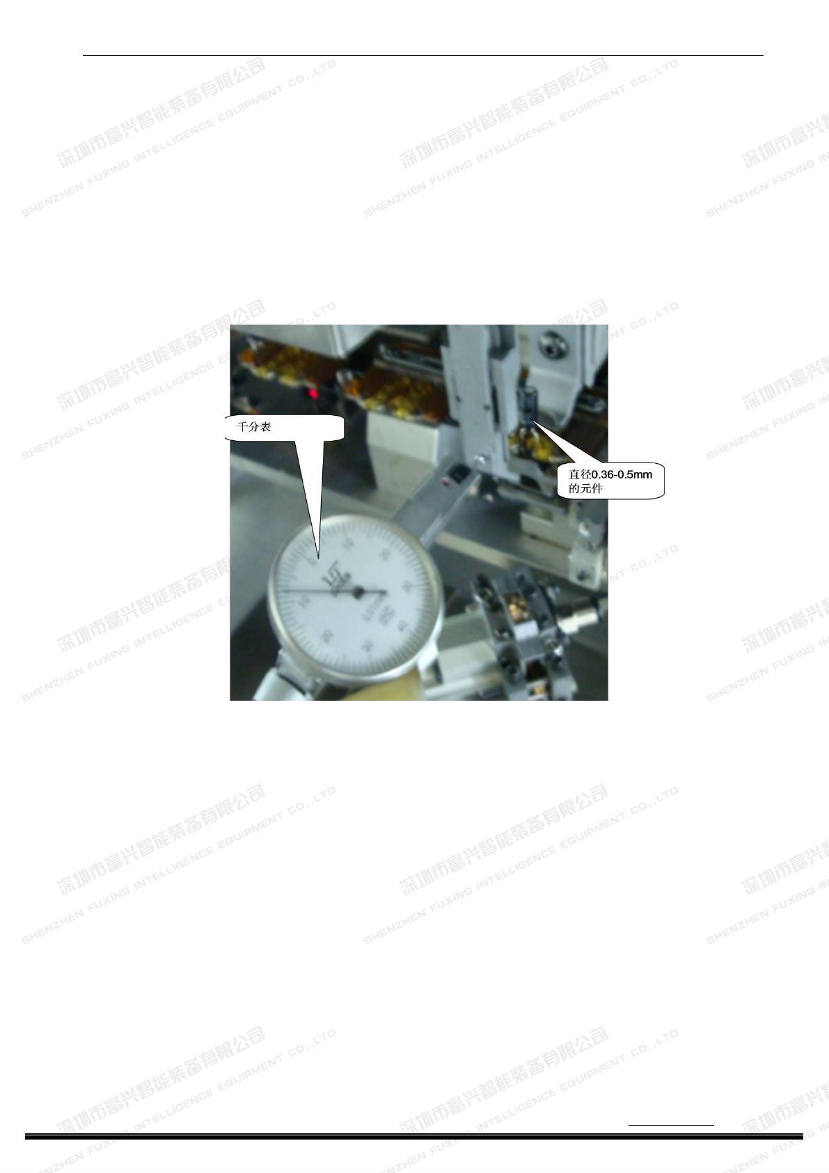 深圳市富兴智能装备有限公司 http:// www .fuxingai.com http:// www.fxznsmt.com 114 2 ) CTA 到 插 件头 行程 调整 。 (1) 打开操作界面的“诊断”选项。 (2) 选 择 引 脚 直 径 在 0.36mm-0.5mm 之 间 的 元 件 , 并 将 元 件 卡 在 弯 形 三 叉 推 料 器 前 面 的那 个 链 夹上 。 (3) 将百 分表的表头与插 件头主爪的 背面相接…
