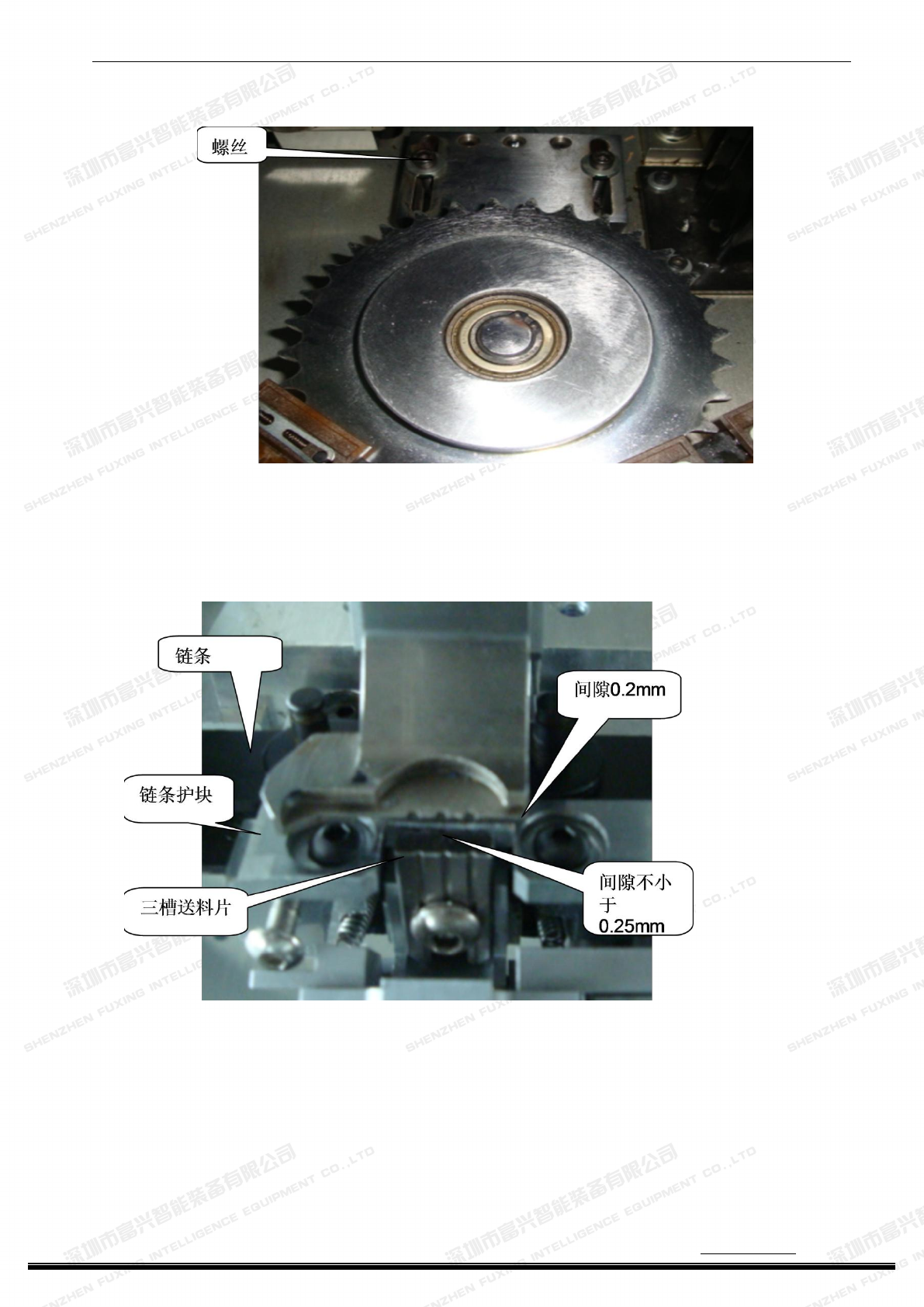 深圳市富兴智能装备有限公司 http:// www .fuxingai.com http:// www.fxznsmt.com 122 9、飞达与链 条位置的调整。 1 ) 机 器 归 零 后 CTA、插 件头 和链 条位 置 正常 后, 松开 飞达 的 固定 螺丝 ,可 左 右 调整飞达的 位置。 2 ) 关掉机器气源 ,用手推出飞达 叉片,让叉片 左边碰到链 夹挡边的左 边位置, 然 后 用 手 往 左 边 推 动 链 夹 到 极 …