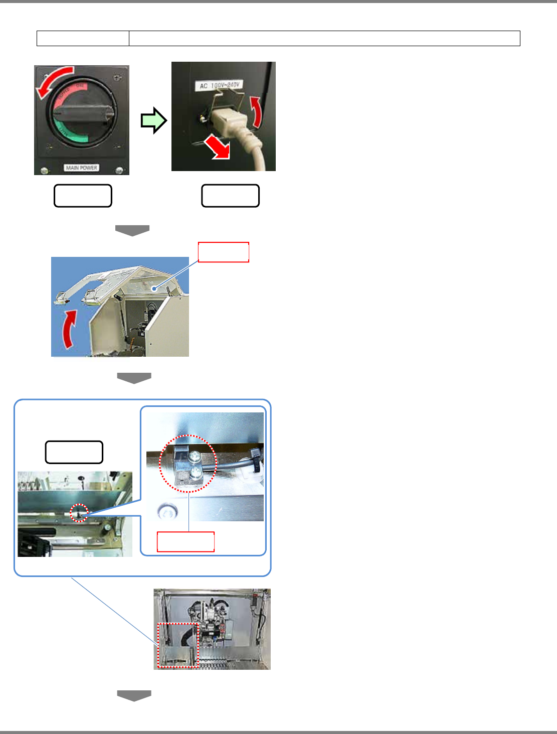 IFMU 操作手册 6.5 定期检查 560 小时 (1 个月 ) Page 6-30 EJW8AC-MB-06O-05 6.5.8 原点传感器的清扫 使用的工具 棉棒等 1 将主电源 OFF 后,拔下电源电缆。 请抬起防脱开的夹具后,拔下电源电 缆。 2 打开安全盖。 3 对原点传感器进行清扫。 请用棉棒擦去传感器附近的附着物。 原点传感器在隔板的内侧。 原点传感器 ( 从后方看的照片 ) 前 侧 安全盖 前 侧 后 侧