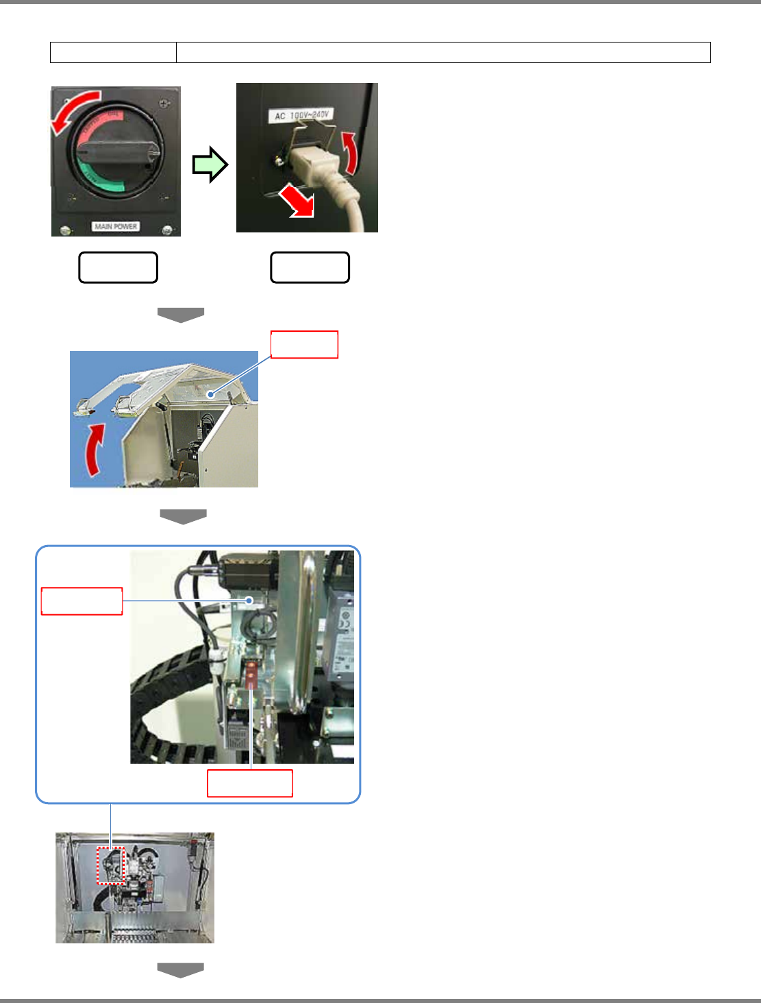 IFMU 操作手册 6.5 定期检查 560 小时 (1 个月 ) Page 6-32 EJW8AC-MB-06O-05 6.5.9 高度检查部的线性导轨的注油 使用的工具 棉棒等 1 将主电源 OFF 后,拔下电源电缆。 请抬起防脱开的夹具后,拔下电源电 缆。 2 打开安全盖。 3 在高度检查部前侧的线性导轨上涂抹 润滑脂。 使用的润滑脂 : LCG100 线性导轨 高度检查部 安全盖 前 侧 后 侧