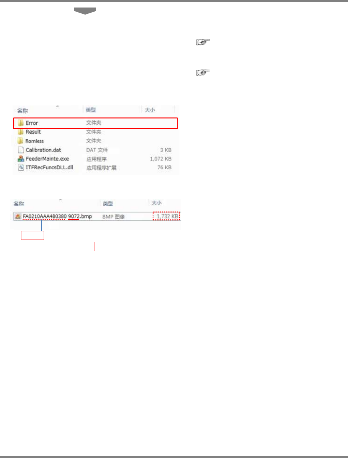IFMU 操作手册 7.2 图像处理错误的应对方法 EJW8AC-MB-07O-06 Page 7-7 7.2.2 错误图像的判断 1 打开错误图像。 ∗ 关于错误图像请参考 7.2.1 错误图像的 保存。 ∗ Microsoft Paint 等的图像查看器来打开上述位 图。 2 确认齿销顶端部的图像。 齿销顶端有损坏时 可能不能正确执行编带进给的动作, 所以建议进行修理。 齿销顶端折断时 可能不能正确执行编带进给的动作, 所以…
