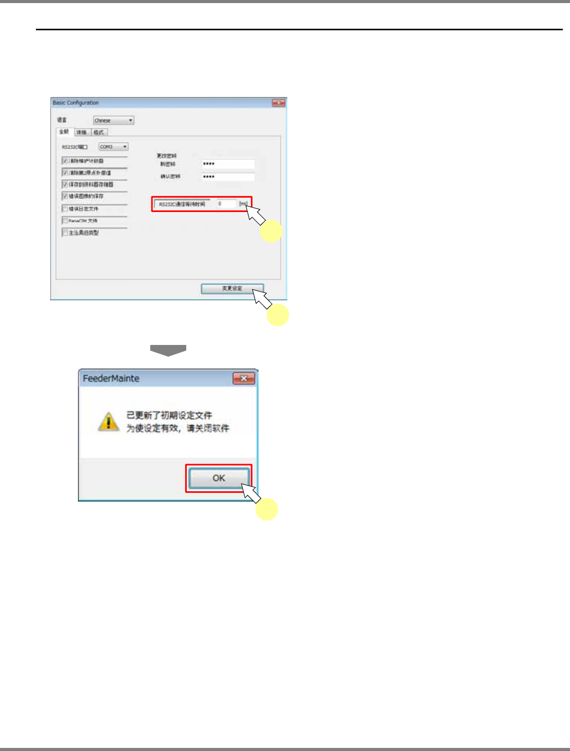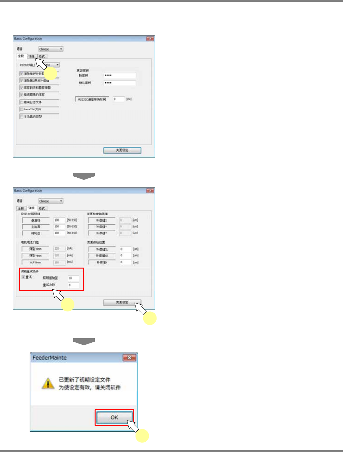 IFMU 操作手册 7.2 图像处理错误的应对方法 Page 7-8 EJW8AC-MB-07O-06 7.2.3 识别再试条件的变更 初始设定画面中进行再试条件的变更 。 1 打开 < 初始设定 > 画面。 ∗ 请参考 “3.3.2 供料器维护软件的初始化 ” 的 步骤 1 ~ 5 。 2 单击 ‘ 详细 ’ 选项卡。 3 设定识别重试功能。 ∗ 设定 “ 识别重试条件 ” 栏的数值。 1. 勾选 ‘Retr y’ 。 2…