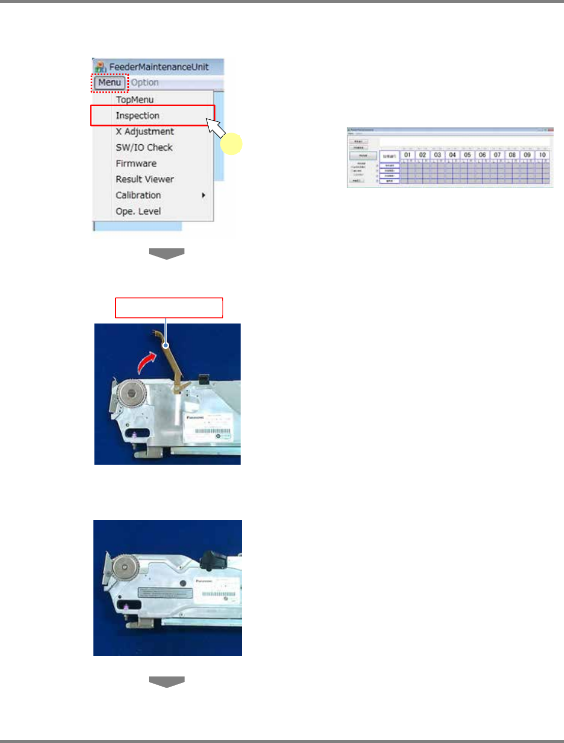 IFMU 操作手册 4.6 自动计测的操作说明 EJW8AC-MB-04O-07 Page 4-29 4.6.2 自动计测的操作步骤 安全盖如处于打开状态时,请将安全 盖关闭。 1 从菜单栏的 Menu 中选择 ‘Inspection’ 。 会显示 < 启动 > 画面。 8 mm/12 mm/16 mm 编带供料器时 2 为 8 mm/12 mm/16 mm 编带供料器 时,打开编带压盖。 24mm/32mm…
